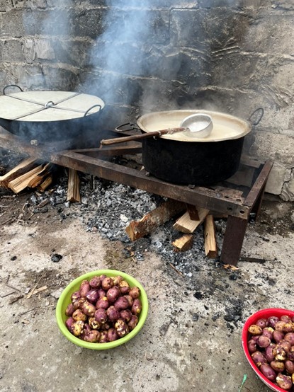 ガスも当然ないので、調理は薪を使って行う。行うと偉そうに言っているが、調理はホスト・シスターのお母様、つまりホスト・マザーがしてくれた。食事は主食と野菜料理の組み合わせが基本である (写真5)。主食は、主食用バナナ (日本でよく食べるものと違って甘くない)、町で買ってきた米、さつまいもが多く、たまにヤムイモ、キャッサバ、「シンガポール」と呼ばれる里芋のような芋、タロイモもいただいた。野菜料理は日本では見ない野菜が多かった。「ビーン」と呼ばれる豆 (ただしさやの方がメイン)、「アイビカ」と呼ばれるすこし粘り気のあるモロヘイヤのような野菜、「チョコ」と呼ばれるツル状の野菜など様々である。それをココナッツスープか、町で買う即席麺の調味粉かで煮るという味付けが多かった。肉や魚は滅多に食べず、魚の缶詰が野菜料理に混ぜられていることが1, 2日に1回くらいといった程度である。村には鶏がおり、特別な時にだけ食べるらしい。私は村に着いたときと離れるとき、そして私の23回目の誕生日にいただいた。村の少年たちがそこら中を闊歩する鶏をスリングショットで狙撃し、気絶したり弱ったりしたものを捕まえる。あっ、と言う間すらない出来事で迫力に満ちていた。